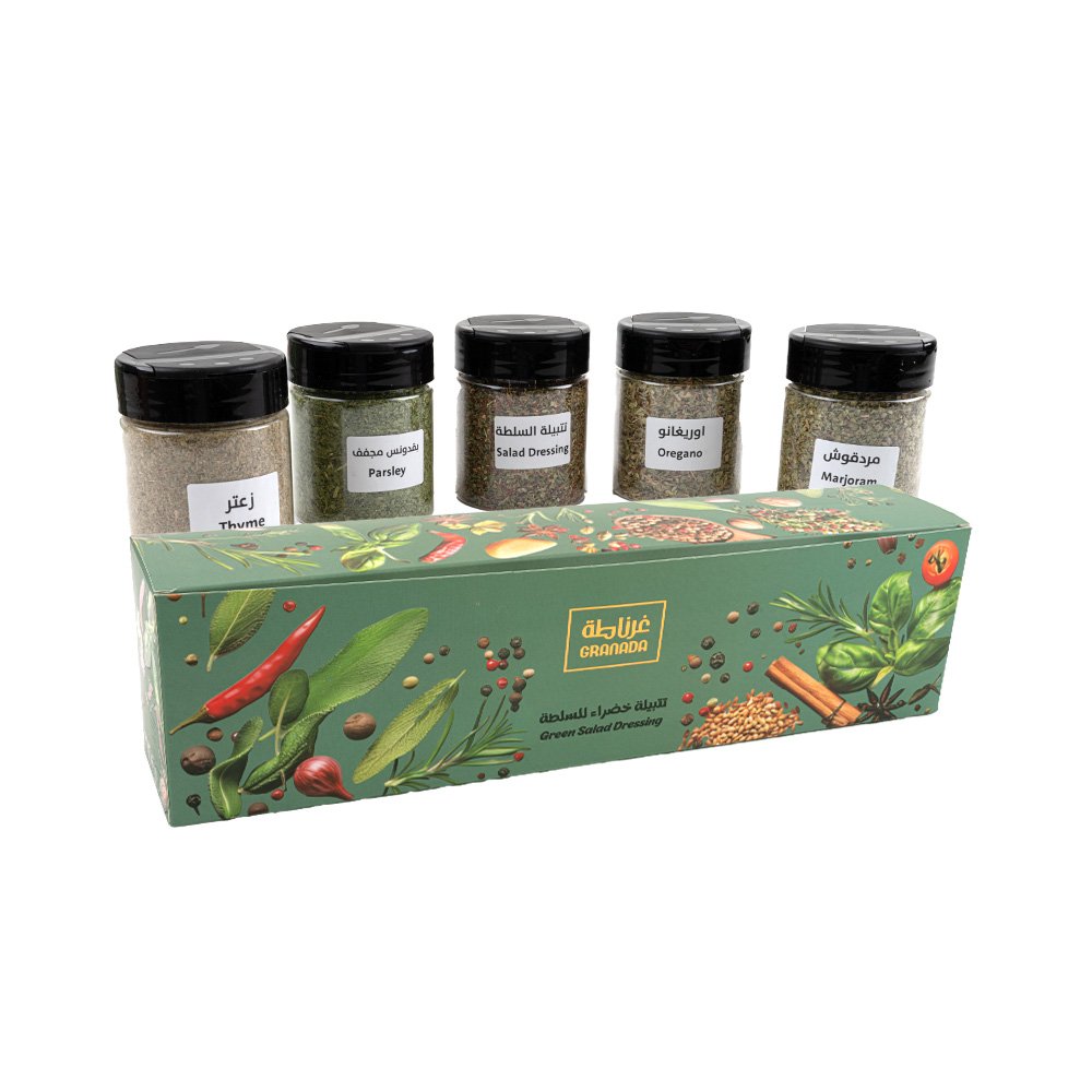 تشمل علب : مردقوش – اوريغانو – تتبيلة سلطة – بقدونس مجفف – زعتر